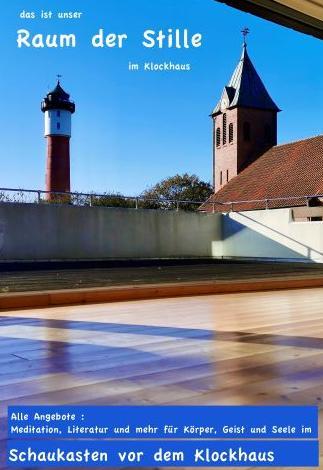 Auf der Südseite der Kirche liegt in einem Straßen-Dreieck unser Labyrinth, das Symbol für den Weg des Lebens. Da steht auch das Klockhaus, benannt nach einer großzügigen Spenderin von der Insel, Waltraud Klock. Klock, plattdeutsch für Uhr, könnte aber auch für das große, runde Fenster stehen, auf dem ohne Ziffern und Zeiger die bedeutsamste Zeit angezeigt wird: Jetzt.