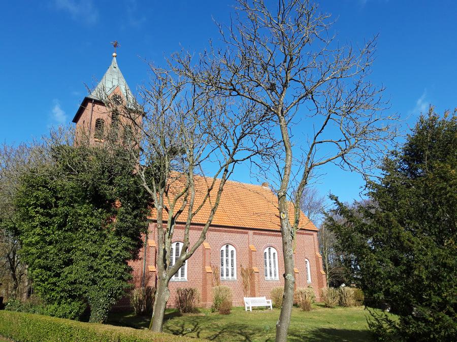 Die Nikolaikirche steht mitten im Dorf nah am alten Leuchtturm. Ihre Tür steht tagsüber für Besuch und Gebet offen.