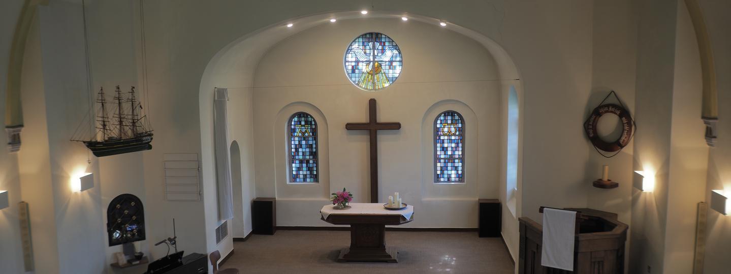 Das Inselleben prägt auch ihr Inneres: das Gedenkschiff "ora et labora" (1924) und der Rettungsring (1926) erzählen von der Seefahrt, farbenfrohe Kirchenfenster bilden Seegeschichten um Jesus aus den vier Evangelien ab. Alle Fenster wurden von Inselfamilien gestiftet und von Hermann Oetken in den 1950er Jahren gefertigt. Die Taube im Chorfenster lässt den Heiligen Geist über Gottesdienst, Taufe und Abendmahl fliegen und mahnt zum Frieden.